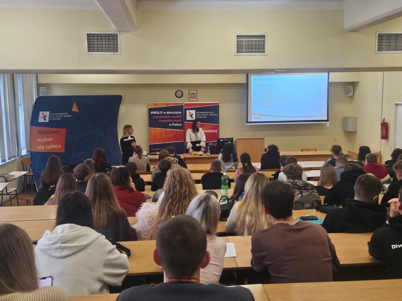 9 grudnia 2025 r. w Międzynarodowej Wyższej Szkole Logistyki i Transportu we Wrocławiu odbył się wykład otwarty Możliwości kariery w firmie Dino Polska S.A. Spotkanie poprowadziły przedstawicielki firmy, zajmujące się rozwojem kariery obecnych i przyszłych pracowników w firmie Dino Polska S.A.